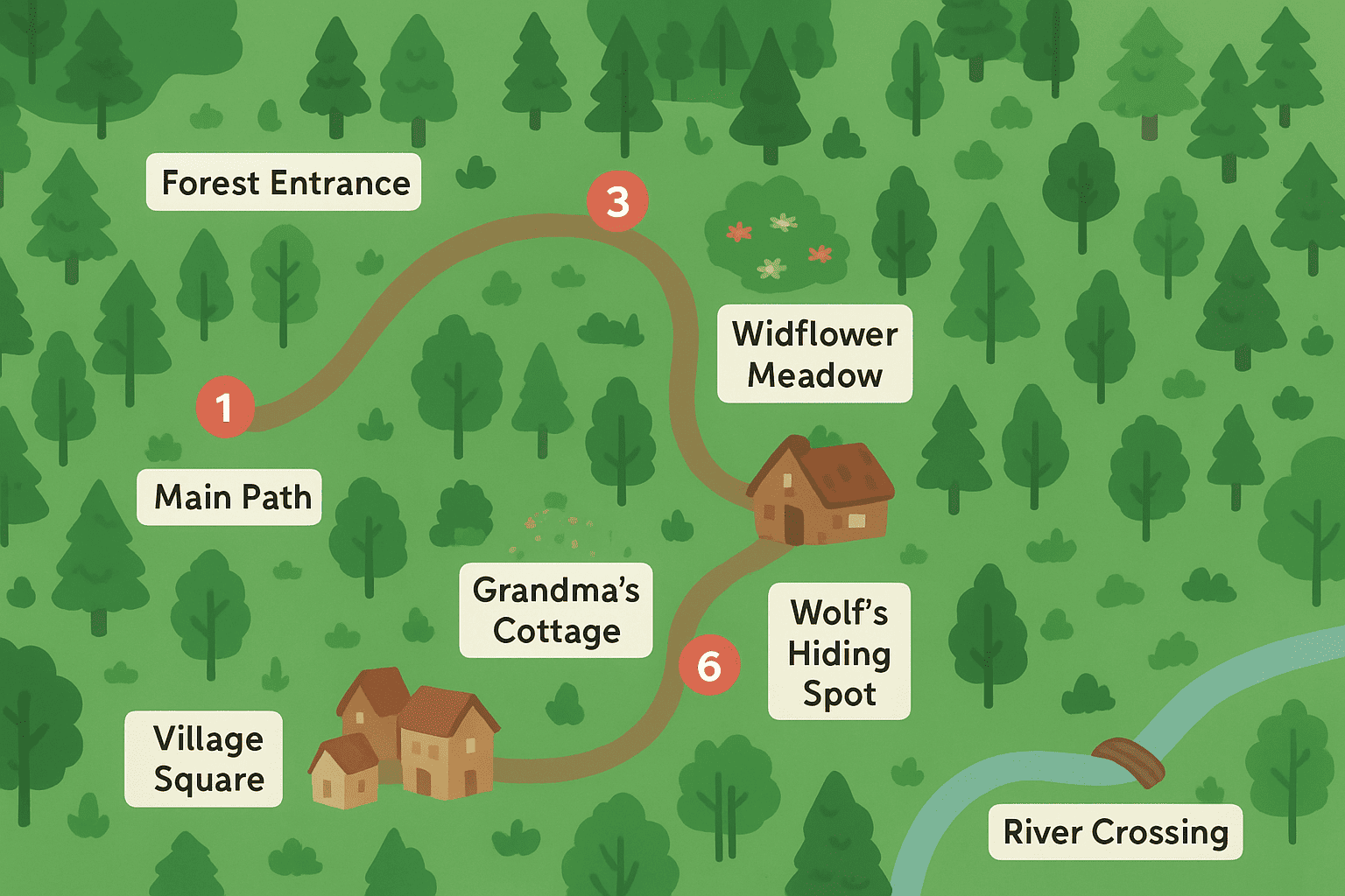 Little Red Riding Hood- Map quizVersión en línea Test your knowledge of the story Little Red Riding Hood! Match the characters, places, and important events from the classic fairy tale. A fun quiz to check your memory and understanding of the story. por Meiramgul Kanatbekova 1 the edge of the woods, where the journey begins. 2 the road through the trees, often winding. 3 where she stops and meets the wolf in some version 4 a small cozy house, the story’s main destination. 5 where Red Riding Hood leaves her home. 6 a natural obstacle along the way. 7 where danger lurks; he waits here.
