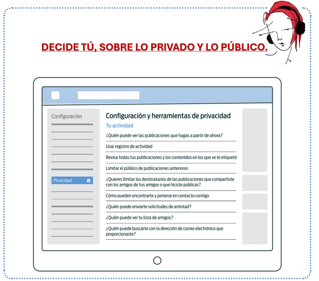 Es importante que seas consciente de qué información compartes y con quién. Especialmente, a cuál pueden acceder desconocidos. Si bien las redes sociales permiten configurar el nivel de privacidad de lo que publicas, los niveles por defecto no suelen ser los más restrictivos. Hoy, llegando a "casa" revisa la configuración de tus cuentas y asegúrate de que el alcance de tu información no vaya más allá de lo que tu quieres (Observa la imagen como referencia).