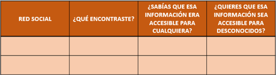 Ingresa con otra cuenta, a dos de tus redes sociales que utilices con más frecuencia (en caso de no tener ninguna, pide a tu madre o padre permiso para realizar el ejercicio con alguna cuenta de ellos), busca tu usuario y completa la tabla de la imagen con tus hallazgos sobre la privacidad de tus datos.