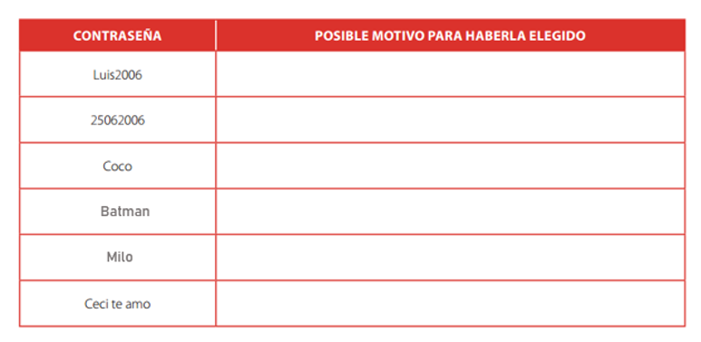 A continuación hay una serie de contraseñas que una persona eligió para usar en distintos sitios de Internet. ¿Se te ocurre qué motivos lo llevaron a elegirlas? ¿Te parecen seguras estas contraseñas? ¿Por qué? Elabora y contesta en Word la siguiente la tabla.