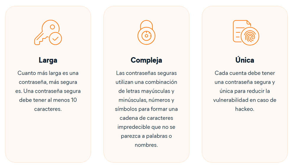 Características principales para crear contraseñas seguras difíciles de hackear. Te recomiendo centrarte en la longitud, la complejidad y la exclusividad de las contraseñas.