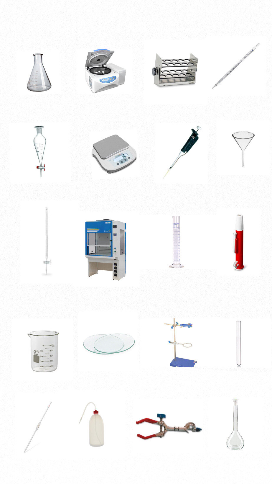 1 ERLENMEYER 2 CENTRIFUGADORA 3 GRADILLA 4 PIPETA GRADUADA 5 EMBUDO DE DECANTACIÓN 6 BALANZA 7 MICROPIPETA 8 EMBUDO CÓNICO 9 BURETA 10 CAMPANA EXTRACTORA DE GASES 11 PROBETA 12 AUXILIAR DE PIPETA 13 VASO DE PRECIPITADO 14 VIDRIO DE RELOJ 15 PIE DE SOPORTE O SOPORTE UNIVERSAL 16 TUBO DE ENSAYO 17 PIPETA AFORADA 18 FRASCO LAVADOR 19 PINZA DE NUEZ 20 MATRAZ AFORADO