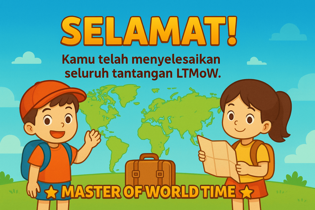 Untuk bisa melanjutkan setiap perjalanan, kamu harus menyelesaikan tantangan tentang waktu, durasi perjalanan, dan zona waktu dunia.