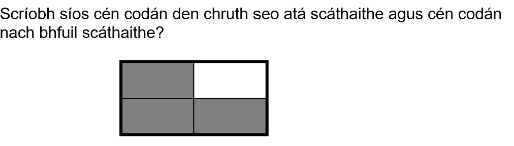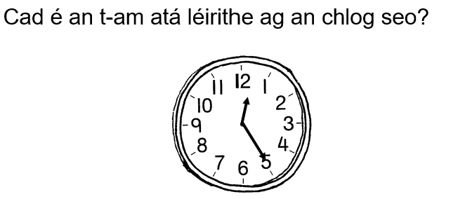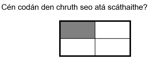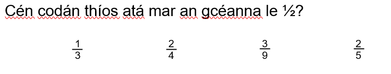 Froggy Jumps Meascán Mata Rang 6 01.12.25Versión en línea Meascán de cheisteanna mata do rang 6. por T Ó Faircheallaigh 1 Freagra an cheist sa phictiúir a 1/4 b 2/4 c 3/4 2 Freagra an cheist sa phictiúir a 1/3 b 2/4 c 3/9 3 Freagra an cheist sa phictiúir a 2/4 & 1/4 b 4/4 & 3/4 c 3/4 & 1/4 4 8÷32= a 2 b 4 c 5 5 8÷64= a 8 b 7 c 9 6 2672+8633= a 11,035 b 11,305 c 11,011 7 1000-863= a 250 b 137 c 200 8 Cad é an briseadh ó £5 dá gceannóinn earra a chosnaíonn £2.99? (What change would I get back from £5 if I spent £2.99?) a £2.01 b £3.01 c £2.50 9 Freagra an cheist sa phictiúir a 12:05 b 12:25 c 17:05 10 Cá mhéad uillinn atá ag Ochtagán? a 8 b 7 c 5 11 Cá mhéad faobhar atá ag ciúb? (How many edges does a cube have?) a 6 b 8 c 12 12 6x9=? a 54 b 60 c 52