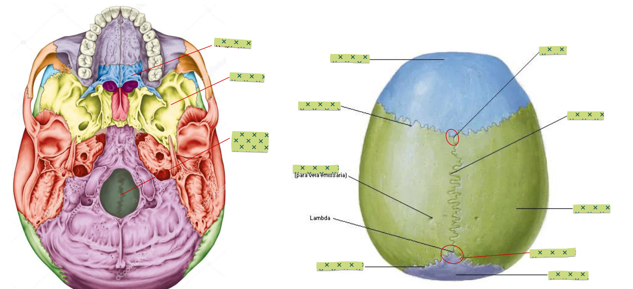 Partes del cráneo (2)Versión en línea anatomia por Rocio Perez Garcia 1 Palatino 2 Etmoide 3 Forma en Magno 4 Hueso frontal 5 Bregma 6 Sutura coronal 7 Forma en parietal 8 Sutura sagital 9 Hueso parietal 10 Sutura lamboidea 11 Lamboidea 12 Hueso occipital