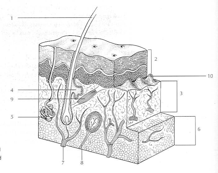 anatomie huidVersión en línea Benoem de delen van de huid. por Wondzorg RHIZO VIVES HBO5 1 haar 2 epidermis 3 dermis 4 talgklier 5 zweetklier 6 subcutis 7 bloedvat 8 zintuig 9 haarspiertje