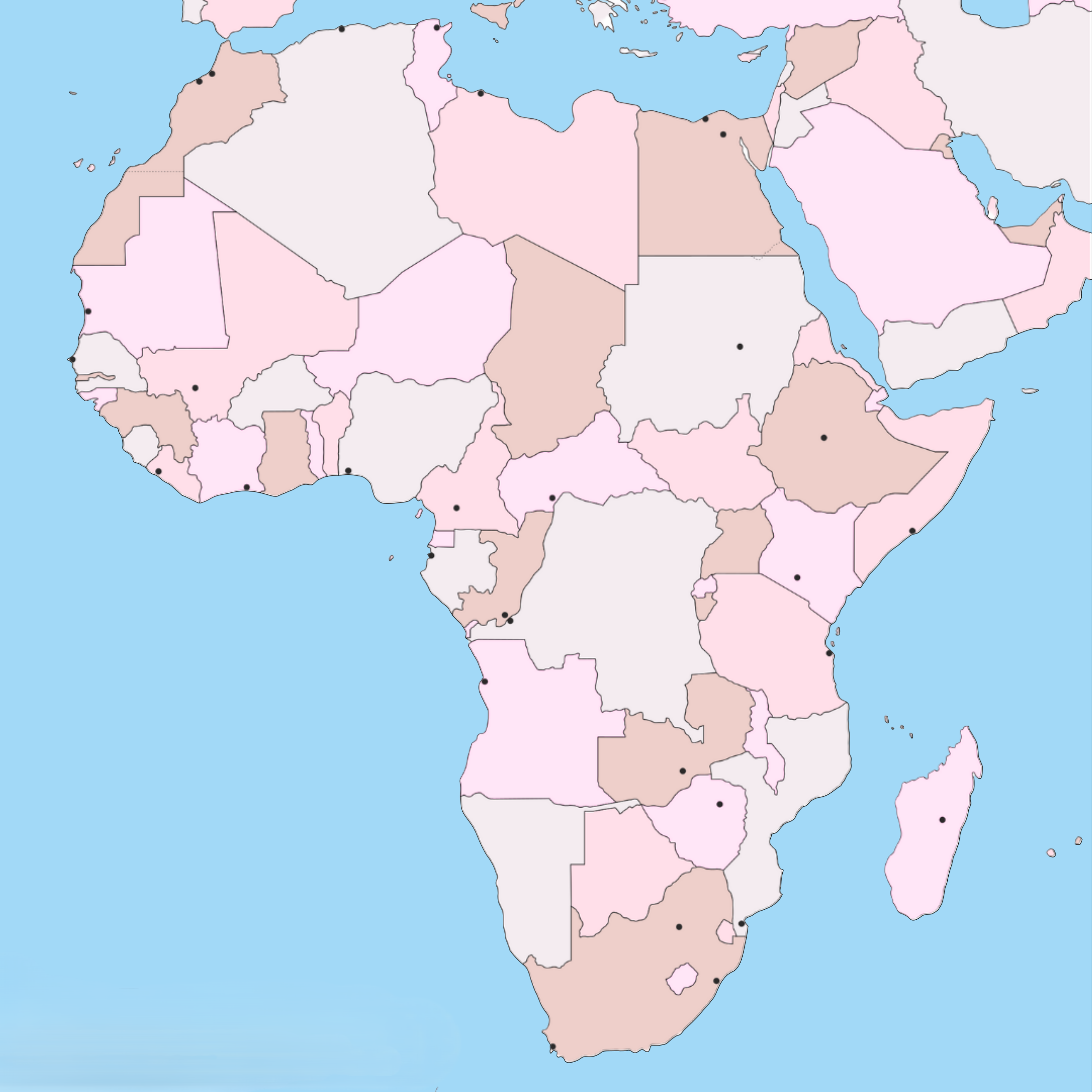 PAÍSES y CAPITALES de ÁFRICAVersión en línea Pon a prueba tus conocimientos de geografía situando correctamente algunos países en el mapa político de África. ¡Demuestra que eres un experto en el continente africano! por Alejandro Villar Villar 1 ANGOLA 2 ARGELIA - Argel 3 CAMERÚN 4 REPÚBLICA DEMOCRÁTICA DEL CONGO - Kinsasa 5 EGIPTO - El Cairo 6 ETIOPÍA - Adís Abeba 7 GHANA 8 GUINEA ECUATORIAL 9 KENIA - Nairobi 10 LIBIA - Trípoli 11 MADAGASCAR 12 MARRUECOS - Rabat 13 MAURITANIA 14 MOZAMBIQUE 15 NIGERIA - Abuya 16 SENEGAL - Dakar 17 SOMALIA 18 SUDÁFRICA - Pretoria / Bloemfontein / Cd. del Cabo 19 SUDÁN - Jartum 20 TANZANIA 21 TÚNEZ - Túnez