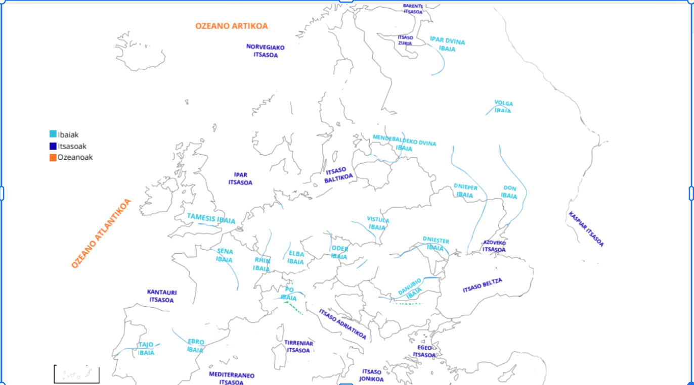europa:ibaiak , itsasoak eta ozeanoakVersión en línea geo-his por Irati Pacheco Ramirez 1 itsaso baltikoa 2 ipar itsasoa 3 mendebaldeko dvina ibaia 4 mendebaldeko dvina ibaia 5 tamesis ibaia 6 sena ibaia 7 rhin ibaia 8 elba ibaia 9 oder ibaia 10 vistula ibaia 11 ipar dvina ibaia 12 volga ibaia 13 dnieper ibaia 14 kantauri itsasoa 15 norvegiako itsasoa 16 tajo ibaia 17 ebro ibaia 18 tirreniar itsasoa 19 itsaso adriatikoa 20 dniester ibaia 21 itsaso jonikoa 22 mediterraneo itsasoa 23 danubio ibaia 24 don ibaia 25 azoveko itsasoa 26 itsaso zuria 27 barents itsasoa 28 egeo itsasoa 29 itsaso beltza 30 kaspiar itsasoa 31 ozeano artikoa 32 ozeano atlantikoa 33 po ibaia