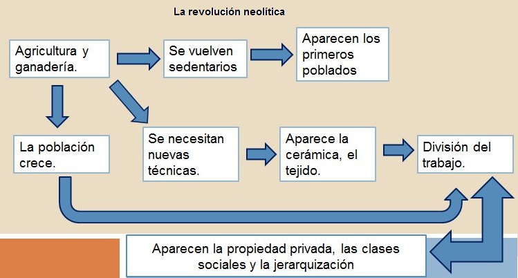 La existencia de excedentes de alimentos propició que una parte de la población ya no tuviera que dedicarse al cultivo de alimentos, esto debido a que la agricultura y domesticación de animales producían los alimentos suficientes y no todos los grupos humanos debían dedicarse a cultivar. Por lo que se dio una especialización de las actividades cotidianas que dio pie a una repartición desigual de la riqueza, ya que la tierra la poseían unos pocos.