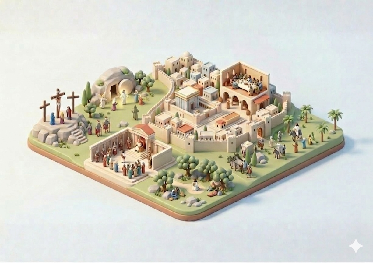 MAPA JERUSALÉN: últimos días de la vida de JesúsVersión en línea Últimos días de la vida de Jesús por CARLOS IZQUIERDO 1 Cena con los apóstoles 2 Entrada en Jerusalén 3 Oración en el huerto 4 Juicio 5 Muerte en la cruz 6 Resurrección