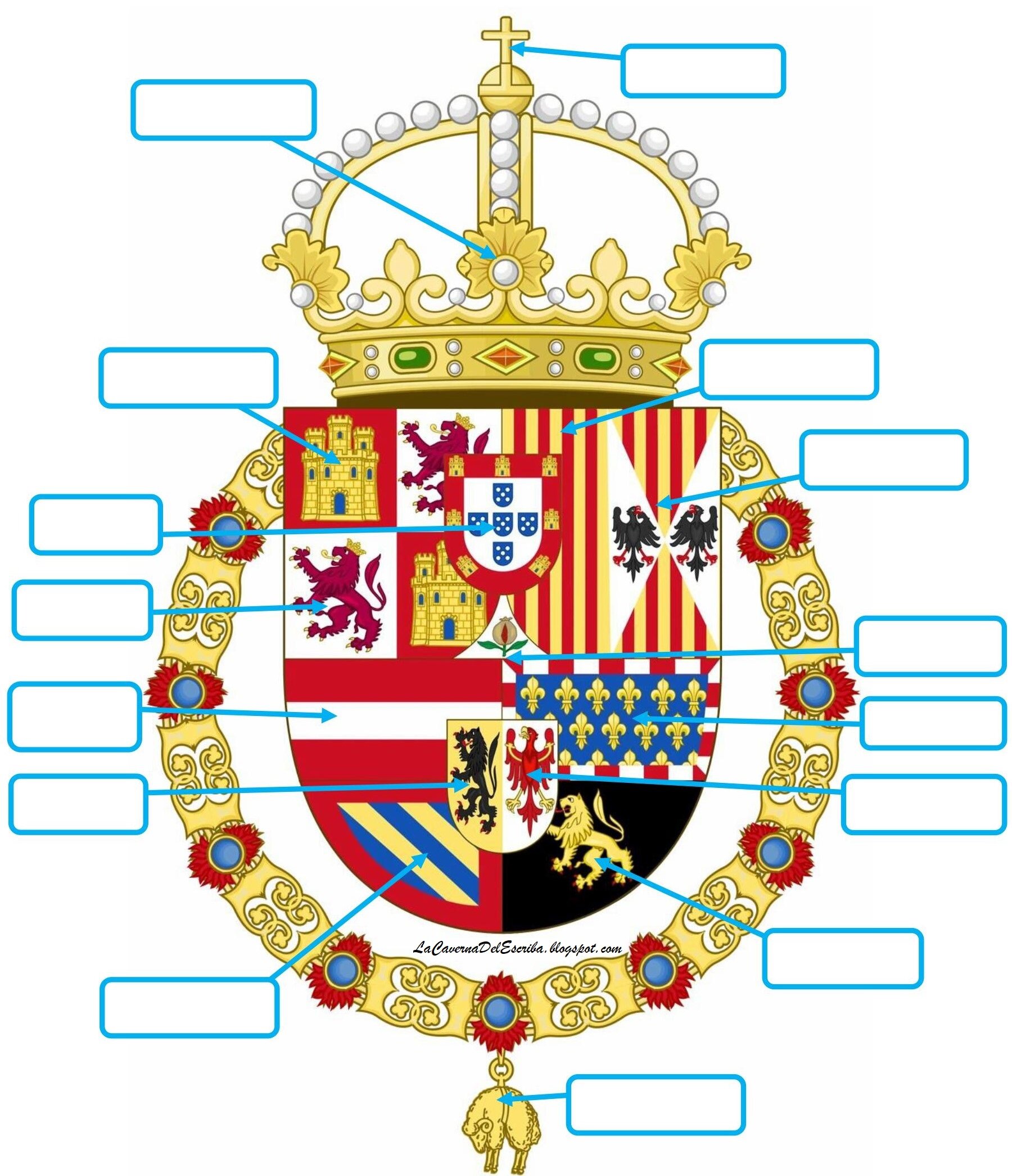 Escudo heráldico Felipe IVVersión en línea Identifica el simbolismo del escudo heráldico de Felipe IV de Habsburgo (2ºESO). https://lacavernadelescriba.blogspot.com por Manuel Enlor 1 Monarquía Hispánica 2 Reino Castilla 3 Reino Portugal 4 Reino León 5 Archiducado Austria 6 Condado Flandes 7 Ducado Borgoña (antiguo) 8 Orden Toisón de oro 9 Ducado Brabante 10 Condado Tirol 11 Ducado Borgoña (moderno) 12 Reino Granada 13 Reino Sicilia 14 Reino Aragón 15 Cristianismo Católico