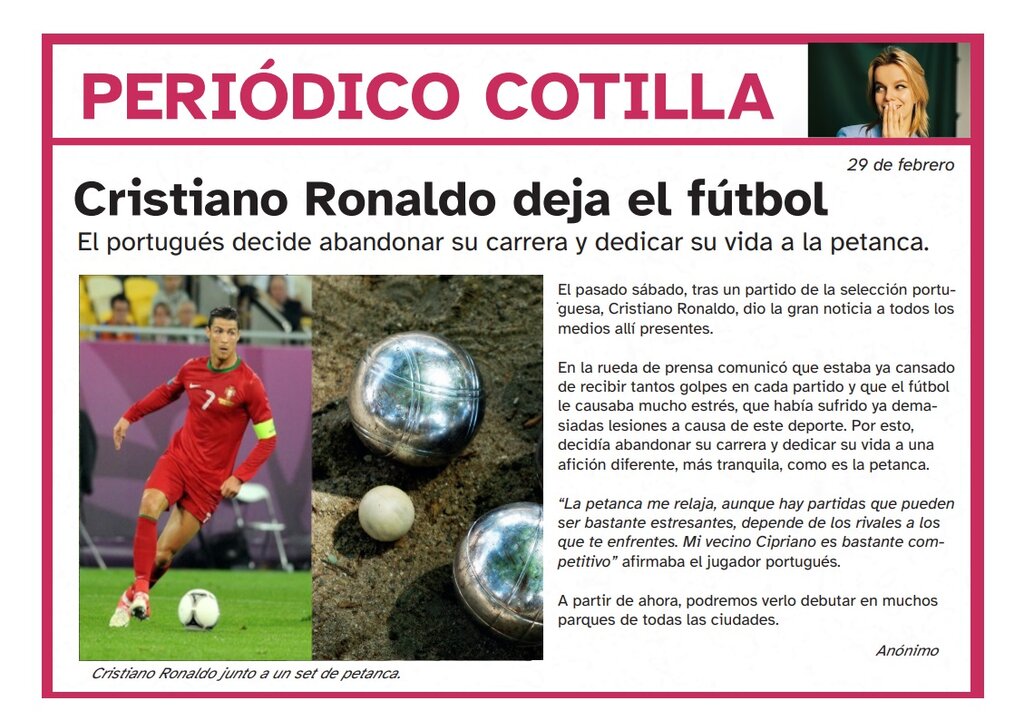 Desmontando bulosVersión en línea Sabrías identificar las noticias falsas y las verdaderas. ¡Todo un reto! por maria esparza tinoco 1 ¿Es cierta esta noticia? Pulsa en la imagen para ampliarla a VERDADERO b FALSO 2 ¿Es esta noticia real? Pulsa en la imagen para ampliarla a VERDADERO b FALSO 3 ¿Es esta noticia real? Pulsa en la imagen para ampliarla a VERDADERO b FALSO 4 El aumento de hielo en zonas de la Antártida desmiente la crisis climática. a VERDADERO b FALSO 5 «Pedro Sánchez y el Depósito de Prosperidad Social anuncian una ayuda de 800 euros llamada Bono Mujer» a VERDADERO b FALSO 6 ¿Es esta noticia real? Pulsa en la imagen para ampliarla a VERDADERO b FALSO 7 ¿Es esta noticia real? Pulsa en la imagen para ampliarla a VERDADERO b FALSO 8 ¿Es real esta noticia? Pulsa en la imagen para ampliarla a VERDADERO b FALSO 9 Se cumple la profecía de Nostradamus a Falso b Verdadero c d Explicación 1 Es falsa. Está publicada en una revista de noticias de broma 2 Es falsa. Cristiano Ronaldo no ha dicho que vaya a dejar el futbol para jugar a la petanca. 3 Si observamos la noticia, podemos encontrar elementos propios de un medio de comunicación fiable; se ve el nombre del medio, autores, secciones... 4 Se malinterpreta un estudio del hielo marino para negar el cambio climático, cuando en realidad la Antártida pierde hielo cada vez más rápido. 5 Fue un bulo que circuló por Whastapp. No existe ningún “depósito de prosperidad social” en España. 6 En esta noticia podemos observar que está escrito por la redacción, que incluye imágenes del lince y aparece el medio de comunicación. 7 Es falsa. X no es un sitio muy fiable en cuanto a noticias... No encotramos una fuente de información fiable en la noticia, ni ningún medio de comunicación. 8 Aunque parezca mentira... Es un medio fiable, vemos autora y si lo comparamos con otras noticias encontraremos coincidencias.