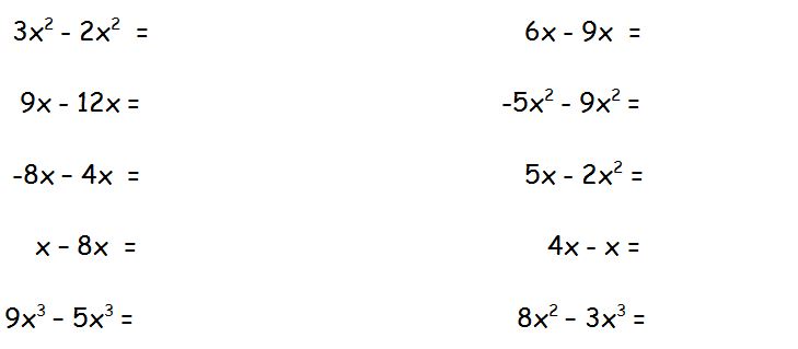 Resta de monomios.Versión en línea Ubicar la respuesta según corresponda. por Instituto Tecnisistemas 1 X al cuadrado. 2 Menos tres X. 3 Menos doce X. 4 Menos siete X. 5 Cuatro X al cubo. 6 Menos cinco X. 7 Menos catorce X al cuadrado. 8 No se puede resolver por ser exponentes diferentes 1 y 2. 9 Tres X. 10 No se puede resolver por ser exponentes diferentes 2 y 3.
