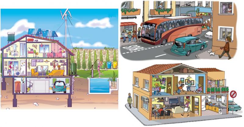 Desarrollo sostenibleVersión en línea Este ejercicio está relacionado con el tema 5 de Savia Digital de 5º de Primaria por Quinto Primaria 1 Agua caliente y calefacción. El agua se calienta con paneles termosolares. 2 Electricidad. Los paneles solares fotovoltaicos transforman la energía solar en energía eléctrica, y el aerogenerador transforma la energía eólica en energía eléctrica. 3 Tratamiento de aguas. Se recoge el agua de lluvia. Las aguas residuales se reciclan para el riego. 4 Piscina ecológica. No es necesario renovar el agua. Se depura de forma natural mediante plantas y filtros de arena. 5 Utilizar el transporte público siempre que sea posible. 6 Aislar bien las paredes y las ventanas de los edificios 7 Realizar una conducción responsable: ir a una velocidad adecuada y apagar el motor si el coche está parado 8 Aprovechar la luz natural siempre que sea posible y apagar las luces que no se utilicen. 9 Utilizar bombillas que consuman menos energía. 10 No abusar de la calefacción ni del aire acondicionado: mantener una temperatura en casa de 21 ºC en invierno y 26 ºC en verano. 11 Elegir electrodomésticos de mayor eficiencia energética, es decir, que obtengan los mismos resultados con menor gasto energético y apagarlos cuando no se usen.