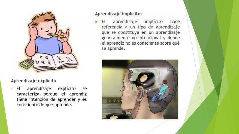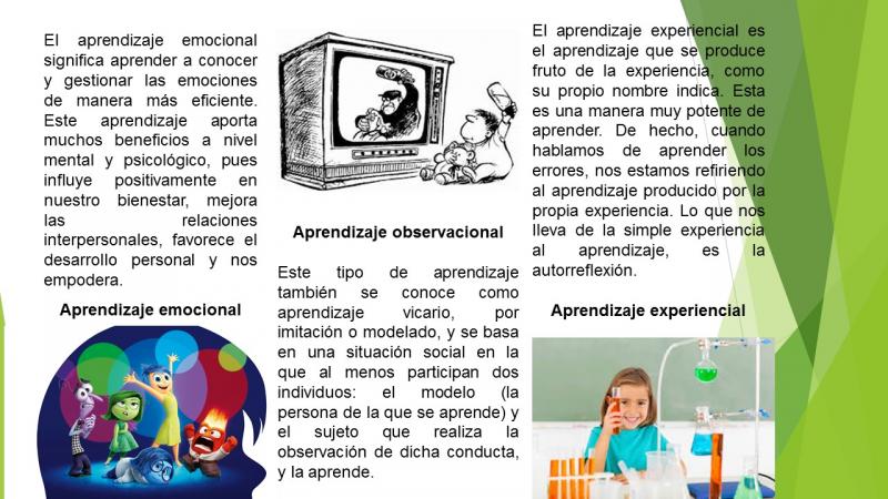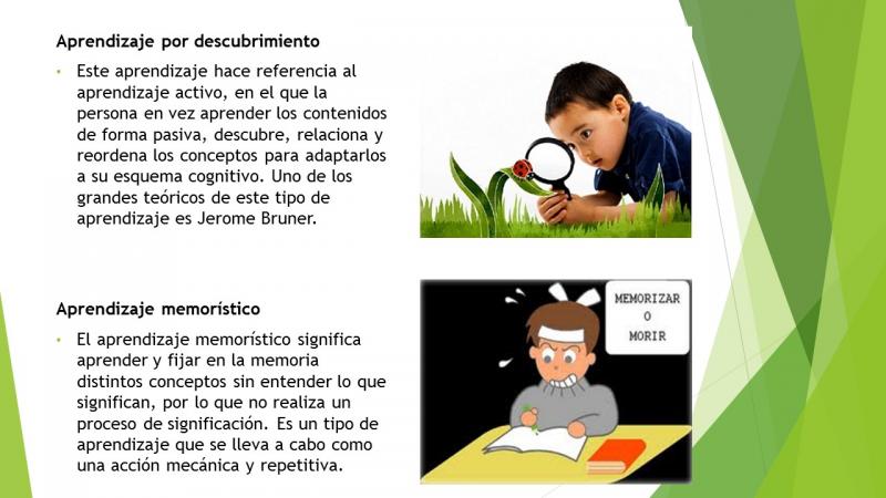 Tipos de AprendizajeVersión en línea La psicología se ha interesado por este fenómeno desde hace varias décadas y son muchos los autores que han aportado un valioso conocimiento sobre qué es y cómo se construye dicho aprendizaje. por Chariana Mejia 1 Tipos de Aprendizaje A lo largo de los años, los estudios de muchos de estos investigadores han permitido ir descifrando cómo funciona nuestra memoria y cómo influye la observación o la experiencia en la hora de construir conocimiento y cambiar nuestra manera de actuar. El aprendizaje hace referencia a la adquisición de conocimientos, habilidades, valores y actitudes, y los seres humanos no podríamos adaptarnos a los cambios si no fuese por este proceso. 2 Clasificación Existen distintos tipos de aprendizaje con características muy distintas entre sí, a continuación definimos cada uno de ellos. 3 Tipos de Aprendizaje 4 Tipos de Aprendizaje 5 Tipos de Aprendizaje Este tipo de aprendizaje se caracteriza porque el individuo recoge la información, la selecciona, organiza y establece relaciones con el conocimiento que ya tenía previamente. En otras palabras, es cuando una persona relaciona la información nueva con la que ya posee. 6 Tipos de Aprendizaje Este tipo de aprendizaje se caracteriza porque el individuo recoge la información, la selecciona, organiza y establece relaciones con el conocimiento que ya tenía previamente. En otras palabras, es cuando una persona relaciona la información nueva con la que ya posee. 7 Tipos de Aprendizaje El aprendizaje cooperativo es un tipo de aprendizaje que permite que cada alumno aprenda pero no solo, sino junto a sus compañeros. El aprendizaje colaborativo es similar al aprendizaje cooperativo. Ahora bien, el primero se diferencia del segundo en el grado de libertad con la que se constituyen y funcionan los grupos. En este tipo de aprendizaje, son los profesores o educadores quienes proponen un tema o problema y los alumnos deciden cómo abordarlo. 8 Tipos de Aprendizaje 9 Tipos de Aprendizaje 10 Tipos de Aprendizaje Con este tipo de aprendizaje denominado aprendizaje receptivo la persona recibe el contenido que ha de internalizar. Es un tipo de aprendizaje impuesto, pasivo. En el aula ocurre cuando el alumno, sobre todo por la explicación del profesor, el material impreso o la información audiovisual, solamente necesita comprender el contenido para poder reproducirlo.