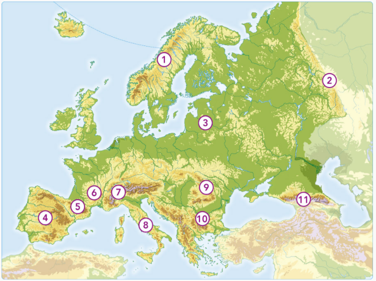 RELLEU EUROPA 1Versión en línea Què en saps? por Sonia Pardo 1 Serralades Escandinaves 2 Serralada dels Urals 3 Gran Planúria Europea 4 Meseta 5 Pirineus 6 Massís Central 7 Alps 8 Apenins 9 Carpats 10 Balcans 11 Caucas
