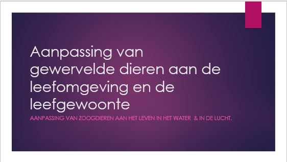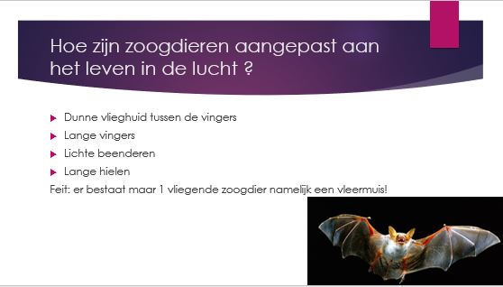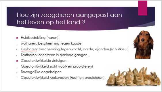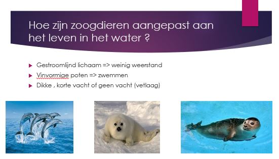 Aanpassing v. gewervelde diereVersión en línea Aanpassing van gewervelde dieren aan de leefomgeving en de leefgewoonte. We bekijken in dit onderdeel de aanpassing van zoogdieren aan het leven in het water & in de lucht. por Alexandra Lopes 1 Aanpassing v. gewervelde dieren 2 Denken 3 soorten dieren 4 zoogdiern aan land 5 Voortbeweging 6 zoogdieren aangepast aan het water 7 zoogdieren aangepast aan lucht