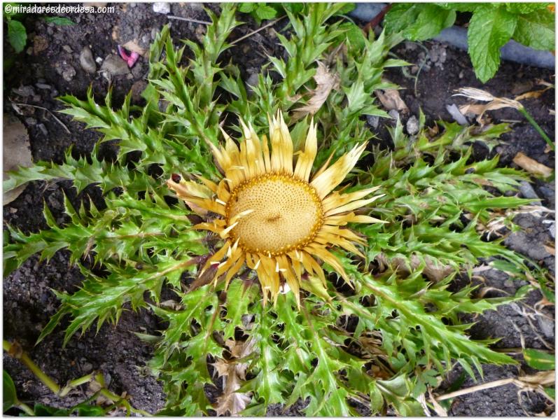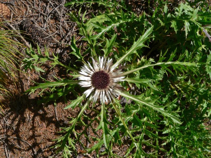 Zurtoin zurruneko lore iraunkorra da, 20 zentimetroko altuerara murriztua. Ia lurrari itsatsita hazten da, eta ebakitako hosto-erroseta arantzatsuaren itxuran loratzen da. Gainera karduaren antzeko braktea zabal eta haragitsuak izaten ditu. Errosetaren erdi-erdian une oro xarma eta freskotasuna mantentzen duen lore burua dago. Hau inguratzen duen 12 bat zentimetrotako zilar-koloreko disko zuria eguzkiaren distirarekin soilik irekitzen da. Bazter eguzkitsuetan, lugorrietan eta mendiko belardi harritsuetan hazten da.