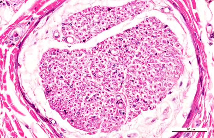 CH Tejido nerviosoVersión en línea Nervio por Brian Hesús Ambrocio Miranda 1 ¿Cuál de las estructuras se origina a partir de la cresta neural? a Corteza suprarrenal b Ganglios simpáticos c Nervios autónomos preganglionares d Neuronas motoras somáticas 2 ¿Cuál de los siguientes neuotransmisores aumenta el gasto cardiaco? a Dopamina b Serotonina c Noradrenalina d Glutamina 3 ¿Cual de las siguientes acerca del Potencial de membrana de células nerviosas es verdadera? a Los potenciales en reposo se mantienen gracias a la entrada de Na en la celula b La entrada de K hace que la membrana recupere su potencial de reposo c La despolarización induce la apertura de los canles de K regulados por voltaje d Los canales de Na regulados por voltaje se activan en el periodo refractario 4 ¿Cuál es caracteristica del perineuro? a Formada por celulas epitelioides que envuelven un fasciculo de fibras nerviosas b Fascia que envuelve una fibra nerviosa c Capa delgada de fibras reticulares que cubre fibras nerviosas individuales d Fascia que excluye macromoléculas y forma la cubierta externa de los nervios 5 ¿Cuál región contiene acetilcolina como único neurotransmisor? a SNC b Union mioneural c Corteza motora d Sinapsis simpáticas postganglionares 6 Los cuerpos de Nissl se conforman por... a Vesiculas sinapticas y acetilcolina b Polirribosomas y RER c Lipoproteina y melanina d Neurofilamentos y microtubulos 7 El cono axónico contiene... a RER b Ribosomas c Micrtúbulos d Aparato de Golgi 8 ¿Cual de las siguientes características se refiere a las vesículas sinapticas? a Elaboran NT b Entran en la hendidura sináptica c Se incorporan a la membrana presinaptica d Se incorporan a la membrana postinaptica 9 ¿Cuál de los siguientes sintomas presentara alguien con enfermedad de Hirschprung? a Ausencia de bóveda craneal b Médula espinal expuesta c Dolores de cabeza d Colon grande, dilatado 10 La mielinizacion de los nervios perifericos es realizada por... a Astrocitos b Oligodendrocito c C´s Schwann d C´s cresta neural 11 Los episodios de desmielinización se asocian a ... a Meningitis b Huntington c Parkinson d Esclerosis múltiple 12 Temblores, marcha festinante y fascies de máscara se asocian con... a Meningitis b Corea de Huntintong c Parkinson d Espondilitis anquilosante 13 La pérdida del GABA se asocia con... a Corea de Huntintong b Meinigitis c Esclerosis múltiple d Espina bífida 14 Se examina con microscopia electrónica el tejido del SNC de un hombre de 80 años. En los citoplasmas de las células de esta muestra tisular se observan varios cuerpos residuales y lipofuscina. ¿Cuál de las siguientes células se describe? a Astrocitos b Neuronas c Oligodendrocitos d Endotelio de capilares 15 ¿Cuál de las siguientes células fagocitan los detritos celulares producidos por el daño neuronal? a Astrocitos fibrosos b Oligodendrocitos c Astrocitos protoplasmáticos d Células de la microglía 16 ¿Cuál de las siguientes forman los plexos coroideos? a Piamadre y aracnoides b Piamadre y epéndimo c Celulas de la barrera aracnoidea d Dura meningea 17 ¿Cuál de las siguientes permite que exista LCR en el espacio subaracnoideo? a Plexos coroirdeos b Vellosidades aracnoideas c Células de la barrera aracnoidea d Capilares fenestrados 18 Un patólogo examina una sección teñida de un tejido nervioso desconocido. Nota células con un cuerpo extremadamente largo, en forma de rayo y múltiples dendritas que se acomodan en forma paralela. ¿Cuál de los siguientes tejidos está examinando el patólogo? a Materia blanca de medula espinal b Materia gris de medula espinal c Corteza cerebelosa d Materia blanca del cerebro 19 ¿Cuál de las siguientes estructuras celulares se encuentra dentro del citoplasma del pericarion, pero no en el axoplasma? a Vesiculas unidas a membrana b Neurofilamentos c Microtúbulos d RER 20 Tinciones apropiadas para estudiar las prolongaciones neuronales a Metálicas pesadas b Argentafines c Cromafines d Glucoafines 21 Nombre de la siguiente estructura a Nervio central b Nervio periférico c Nervio Asensorial d Nervio mielinico 22 Nombre de la siguiente estructura a Plexo capilar b Plexo coroideo c Tendinocitos d Ependimo 23 A qué corresponde la siguiente imagen a Corteza cerebral b Corteza ganglionar c Corteza talámica d Corteza cerebelar 24 A qué corresponde la siguiente imagen a Neuronas cerebrales b Neuronas de ganglios simpaticos c Neuronas de nervio periferico d Neuronas cerebelares Explicación 14 En cerebros de personas de edad mayor las neuronas de algunas regio- nes acumulan cuerpos residuales y lipofuscina. Ambas inclusiones citoplásmicas se deben a metabolismo y actividad autofágica intracelular. 19 El axoplasma contiene la mayor parte de los organelos que contiene el citoplasma del pericarion, con excepción del retículo endoplásmico rugoso.