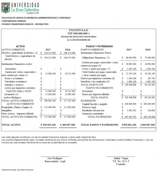 ESF - Mapa InteractivoVersión en línea Estado de Situación Financiera - Mapa Interactivo por JOSE EFRAIN CHOCONTA MORENO 1 Presenta la situación financiera del ente económico en una fecha determinada. Debe elaborarse por lo menos una vez al año, al cierre de cada periodo contable. 2 Representación financiera de un recurso obtenido por el ente económico como resultado de eventos pasados, de cuya utilización se espera que fluyan a la empresa beneficios económicos futuros 3 Representación financiera de una obligación presente del ente económico, derivada de eventos pasados en virtud de la cual se reconoce que en el futuro se deberá transferir recursos o proveer servicios a otros entes 4 Valor residual de los activos del ente económico, después de deducir todos sus pasivos 5 Partidas que se pueden realizar, vender o consumir en un periodo no mayor a 1 año 6 Recursos convertibles en efectivo en plazo superior a 1 año + los de naturaleza permanente utilizados en el negocio y que no son destinados a la venta 7 Obligaciones del ente económico con terceros que deben cubrirse en plazo inferior a 1 año 8 Compromisos del ente económico que se deben cubrir en un periodo mayor a 1 año 9 Se denominan Estados Financieros Certificados, cuando está diligenciado y firmado este espacio 10 Incluye las inversiones a corto plazo (<3m) de gran liquidez, fácilmente convertibles en importes determinados de efectivo, sujetos a un riesgo poco significativo de cambios en su valor 11 Contratos que dan lugar a un activo financiero de una entidad y a un pasivo financiero o a un instrumento de patrimonio de otra. 12 Contratos que dan lugar a un activo financiero de una entidad y a un pasivo financiero o a un instrumento de patrimonio de otra. 13 Activos poseídos para ser vendidos en el curso normal del negocio, en proceso de producción con vistas a esa venta; o en forma de materiales o suministros, para ser consumidos en el proceso de producción, o en la prestación de servicios. 14 Son activos tangibles que: (a) Se mantienen para su uso en la producción o suministro de bienes o servicios, para arrendarlos a terceros con propósitos administrativos; y (b) Se esperan usar durante más de un periodo. 15 Activo identificable, de carácter no monetario y sin apariencia física. 16 Es indispensable presentar estos campos para que los Estados Financieros sean comparativos. 17 Es indispensable presentar estos campos para que los Estados Financieros sean comparativos. 18 Es indispensable presentar estos campos para que los Estados Financieros sean comparativos.