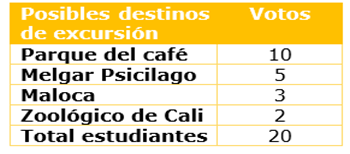 GRÁFICAS ESTADÍSTICASVersión en línea El siguiente test, contiene ejercicios sobre datos estadísticos de la información recolectada en un grupo de estudiante. Donde a partir de esta se pregunta sobre el porcentaje de los resultados obtenidos por Marisel Cifuentes 1 En el grado décimo se realizó una encuesta sobre el destino preferido para realizar la excursión de fin de periodo. En la tabla se representan los resultados obtenidos: Calculemos el porcentaje que representan cada uno de los resultados obtenidos en la elección de los estudiantes. Responde: ¿Qué porcentaje representan los 10 votos que corresponden al lugar parque del café? a 50% b 30% c 15% d 25% 2 ¿Qué porcentaje representan los 5 votos que corresponden al lugar melgar Psicilago? a 24% b 15% c 20% d 25% 3 ¿Qué porcentaje representan los 3 votos que corresponden al lugar Maloca? a 18% b 13% c 15% d 28% 4 ¿Qué porcentaje representan los 2 votos que corresponden al lugar Zoológico de Cali? a 30% b 10% c 20% d 40% 5 Qué porcentaje representa los votos del parque del café y el zoológico de Cali? a 10% b 30% c 40% d 60%