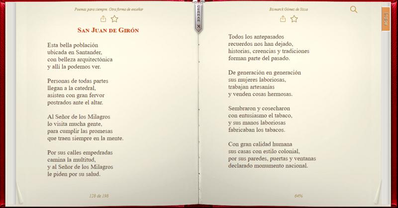 Poemas de nuestra regiónVersión en línea A continuación, encontrarás un poema de la región andina, llamado "San Juan de Girón" por Mi proyecto MoQuba 1 Lectura 1 2 Lectura 1 3 Lectura 1