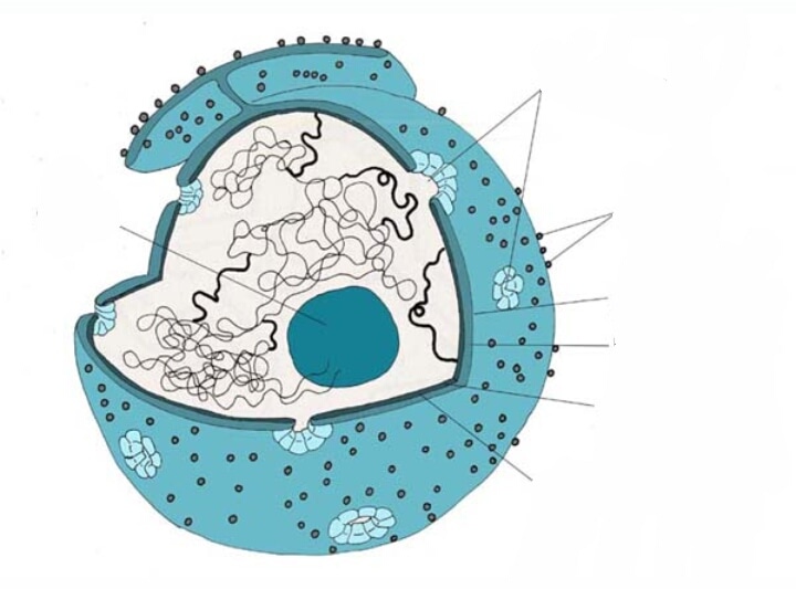 EL NÚCLEO DE LAS CÉLULASVersión en línea CÉLULAS EUCARIOTAS ANIMALES por Maria Ayala Molina 1 RIBOSOMAS 2 MEMBRANA NUCLEAR EXTERNA 3 NUCLÉOLO 4 POROS NUCLEARES 5 LÁMINA FIBROSA 6 ESPACIO PERINUCLEAR 7 MEMBRANA NUCLEAR INTERNA