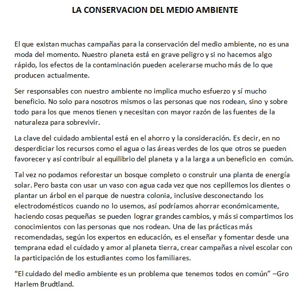 EVALUACION ESPAÑOL GRADO 8Versión en línea EVALUACION BIMESTRAL ESPAÑOL SEGUNDO PERIODO GRADO 8 por SERGIO VALENZUELA 1 Según el texto como podemos cuidar el medio ambiente: a Desconectar los electrodomésticos cuando no se usen b Plantar un árbol c Usar un vaso con agua e el cepillado de los dientes d Todas las anteriores 2 ¿Porque el planeta está en grave peligro? a Por los efectos de la contaminación b Por la delincuencia c Por la corrupción d Por los malos hábitos 3 3. Quien dijo “el cuidado del medio ambiente es un problema que tenemos todos en común”: a John Knox b Gro Harlem Brudtland c William Shakespear d Txema Campillo 4 Que lograremos cuidando el medio ambiente en que vivimos: a Nada porque no es importante b Que haya más vegetación c Generar más empleo d Mejorar la calidad de vida para nuestros predecesores 5 ¿Cuál es la clave del cuidado ambiental? a La comunicación b El estudio c El ahorro y la consideración d a) La comunicación b) El estudio c) El ahorro y la consideración d) El respeto 6 “Ser ecologista en el primer mundo es relativamente fácil. Prueba a serlo en Kenia como mujer” de quien es esta frase a Gro Harlem Brudtland b John Knox c Txema Campillo d a) Gro Harlem Brudtland b) John Knox c) Txema Campillo d) Ninguno de los anteriores 7 En base al ensayo, cual es la practica más recomendada según los expertos en educación: a a) Enseñar y fomentar desde temprana edad el amor al prójimo b Enseñar y fomentar desde temprana edad el cuidado y el amor por el planeta c Enseñar y fomentar desde temprana edad el respeto por lo ajeno d Enseñar y fomentar desde temprana edad el cuidado y el amor por sí mismo. 8 Ser responsable con el medio ambiente es un beneficio para: a Nosotros mismos b Futuras generaciones c Los que tienen menos y necesitan de ella para subsistir d Todas las anteriores 9 Según el ensayo como más podemos ayudar para mejorar la calidad de vida para nuestros predecesores a Ver videos y publicar en redes sociales b Usando nuestra creatividad al reciclar y compartiendo nuestros conocimientos, participando sin reclamar. c Respetando a quienes y a lo que nos rodean d Ninguna de las anteriores 10 El ensayo está dedicado a: a a) La conservación del medio ambiente b) El autocuidado c) Rechazo al maltrato animal d) Estudio de las plantas b La conservación del medio ambiente c El autocuidado d Rechazo al maltrato animal e Estudio de las plantas 11 Según la RAE ¿qué es la literatura? a Un verbo conjugado b Es el arte de la expresión verbal c Una narración de ficción d Ninguna de las anteriores 12 El cuento hace parte de la literatura: a Literatura de fantasía b Literatura oral c Literatura realista d Ninguna de las anteriores 13 El tipo de literatura más conocido es: a Literatura culta b Literatura infantil c Literatura griega d Ninguna de las anteriores 14 La fundación de Bogotá hace parte de laliteratura: a Literatura china b Literatura hebrea c Literatura de la colonia d Ninguna de las anteriores 15 Franz Kafka autor de la metamorfosis nació en y en el año: a Alemania el 5 e agosto de 1.800 b Praga el 3 de julio de 1.883 c Venezuela el 10 de agosto de 1.880 d Ninguna de las anteriores 16 Desde el punto de vista semántico la oración activa es: a En la que el sujeto realiza la acción verbal b En la que el verbo es la que conjuga la acción c En la que el sujeto no va escrito d Ninguna de las anteriores 17 La expresión artística en verso más importante es: a El cuento b La novela c El romance d Ninguna de las anteriores 18 El autor del Carnero es: a Gabriel García Márquez b Hernán Domínguez Camargo c Juan Rodríguez Freyle d Ninguno de las anteriores 19 La frase que va en el separador que pintaste el dia 23 de abril fue: a Gran día del idioma b La pluma, el idioma del corazón c La pluma es el lenguaje del alma d Ninguna de las anteriores 20 La forma correcta de escribir las palabras según el uso de la S es: a Diberso – perverso b Diverso – perverso c Diverso-perverzo d Ninguna de las anteriores. 21 La oración en análisis es: a A. Oración simple b Oración compuesta c Oración nominal d Oración exclamativa 22 Un concepto de oración puede ser: a Unidad mínima del habla con sentido completo b Unidad mínima indivisible y diferenciado c Unidad mínima con significado d La suma de ideas 23 Los prefijos son: a Formación de las palabras b Palabras compuestas c Significados d Ninguna de las anteriores 24 Un ejemplo de prefijo es: a Noel b Cama c Deshecho d Ninguna de las anteriores e Noel f Cama 25 Los prefijos se escriben necesariamente : a Juntos b Separados c Por silabas d Ninguna de las anteriores 26 ¿Que son los sufijos? a Vocablos b Secuencias lingüísticas c Significados d Ninguna de las anteriores