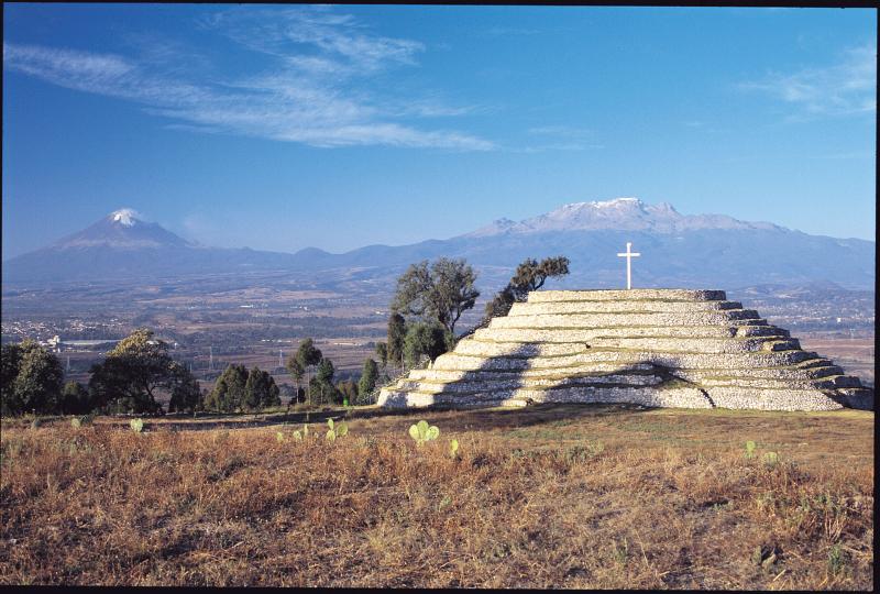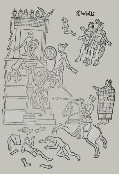 Antes de dirigirse hacia Tenochtitlan, Cortés llega a Cholula,95​ ciudad tributaria y aliada de los mexicas con una población de treinta mil habitantes, que tenía un arraigado culto a Quetzalcóatl.96​ Los tlaxcaltecas no eran amigos de los cholultecas y advirtieron a los españoles no confiar en ellos.97​ Una comitiva de cholultecas dirigida por los capitanes Tlaquiach y Ttalchiac, salió al encuentro del ejército de Cortés siendo recibidos y hospedados cuatrocientos españoles y cuatrocientos totonacas dentro de la ciudad, pero los dos mil tlaxcaltecas a quienes consideraban enemigos, debieron acampar en la periferia.96​ Durante dos días el trato para los recién llegados fue hospitalario; poco después, las autoridades cholultecas comenzaron a evadir a Cortés y sus capitanes,97​ ya que habían recibido en forma secreta instrucciones de Moctezuma para realizar una emboscada y aniquilar a los españoles.98​ Una anciana que pretendía convertirse en la suegra de Malintzin confió a esta lo que se tramaba y poco después la intérprete por su parte alertó a Cortés.96​