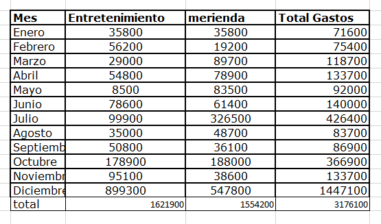 los gastos que tiene camilaVersión en línea camila desea saber que tanto dinera gasta enre refrigerios y entretenimiento. asi que hace una tabla mensual para analizar sus gastos. por andres morales arias 1 ¿Cuál es el mes donde mas gasta dinero en entretenimiento? a en noviembre b en agosto c en enero d en diciembre 2 ¿En qué mes tuvo el menor gasto en merienda? a en junio b en febrero c en diciembre d en enero 3 ¿Cuánto dinero gasto Camila en diciembre? a 450.900 b 133.700 c 1.447.100 d 1.554.200 4 ¿si Camila gana 2.450.000 pesos al mes aproximadamente, que porcentaje de su sueldo lo gasta entre entretenimiento y meriendas anualmente? a 12% b 14% c 9.80% d 10.80%