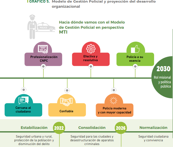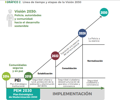 La concepción y visión estratégica policial en el año 2030 considera un plan de respuesta estratégico policial para la seguridad en función de actuar en las fases de estabilización los primeros años, que serán de impacto en conflictividades y seguridad en torno a un escenario de posconflicto, consolidación de la seguridad ciudadana y de normalización, a saber: