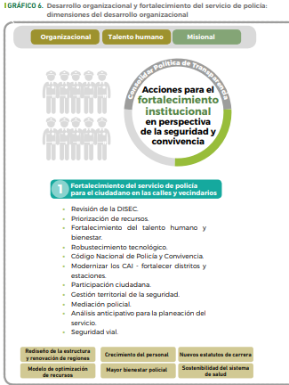 Fortalecimiento organizacional Dentro del proceso de Modernización y Transformación Institucional se ha proyectado el fortalecimiento de la Inspección General, como instancia encargada del control frente al comportamiento ético y disciplinario en la Institución, se ha fortalecido la Política Integral de Transparencia Policial, ampliando el control externo y la veeduría social sobre la Institución, así como la rendición de cuentas pública y los balances de desempeño policial, fortaleciendo la operación disciplinaria. Se avanza, así mismo, en el desarrollo de una hoja de ruta de trabajo con la Procuraduría General de la Nación.