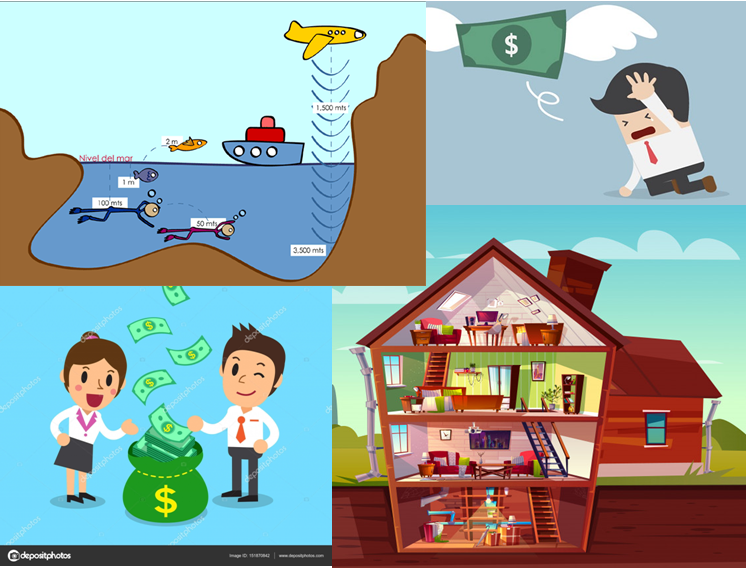 Números EnterosVersión en línea Relacionar la palabra con la imagen según corresponda. por Ramón Jimenez 1 Sobre el nivel del mar 2 Debemos dinero 3 Ganamos dinero 4 Sótano 5 Planta alta 6 Debajo el nivel del mar