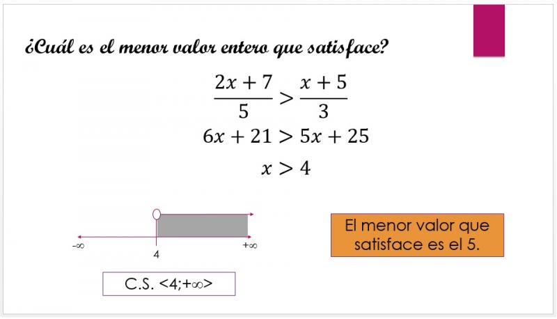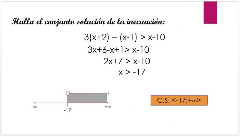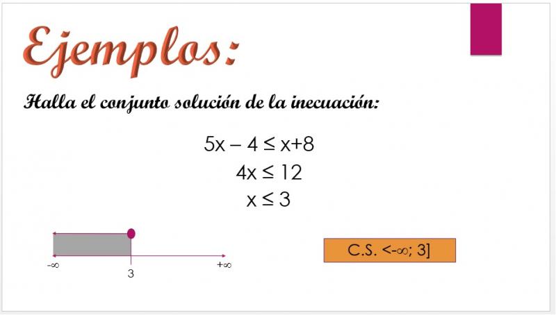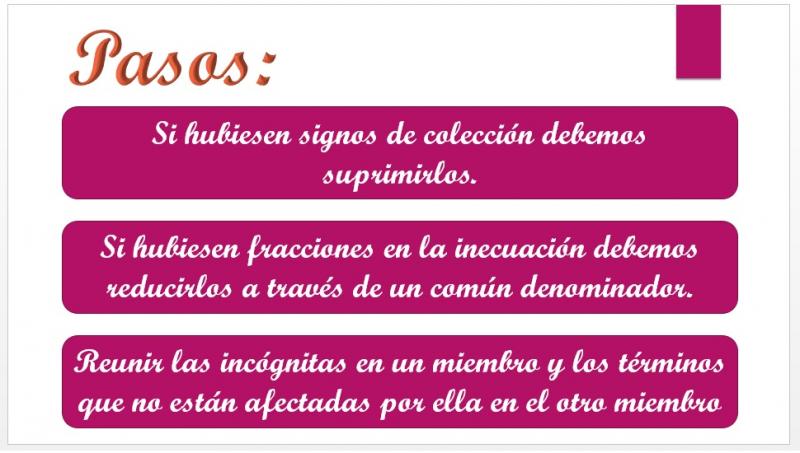 Inecuaciones linealesVersión en línea Método de resolución de una inecuación lineal por Denisse Samame 1 Inecuaciones INECUACIONES 2 Inecuaciones INECUACIÓN LINEALUna inecuación lineal o de primer grado en una variable "x", es una desigualdad de la forma:P(x) = ax + b > 0 (mayor o mayor igual)P(x) = ax + b < 0 (menor o menor igual)La técnica para resolver una inecuación lineal es análoga a la solución de una ecuación lineal de una incógnita. Se basa en la aplicación de axiomas de orden y de teoremas. 3 Pasos 4 Pasos 2 5 Ejemplo 1 6 Ejemplo 2 7 Ejemplo 3
