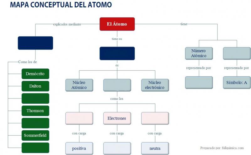 El Átomo y sus EstructurasVersión en línea Es la unidad mas pequeña en la que se puede dividir la materia sin que pierda las propiedades químicas. por Siliana Pallares Santiago 1 El átomo El ÁtomoProviene del latín atomum (sin división), es la unidad mas pequeña en la que se puede dividir la materia sin que pierda las propiedades químicas, es decir sus propiedades como elemento químico. También es denominado como la partícula fundamental de la materia. 2 Estructura del Átomo Estructura del ÁtomoEn el átomo se distinguen dos partes: el núcleo y la corteza. El núcleo es la parte central del átomo y contiene partículas con carga positiva, los protones, y partículas que no poseen carga eléctrica, es decir son neutras, los neutrones. La masa de un protón es aproximadamente igual a la de un neutrón. Todos los átomos de un elemento químico tienen en el núcleo el mismo número de protones. Este número, que caracteriza a cada elemento y lo distingue de los demás, es el número atómico y se representa con la letra Z.La corteza es la parte exterior del átomo. En ella se encuentran los electrones, con carga negativa. Éstos, ordenados en distintos niveles, giran alrededor del núcleo. La masa de un electrón es unas 2000 veces menor que la de un protón. Los átomos son eléctricamente neutros, debido a que tienen igual número de protones que de electrones. Así, el número atómico también coincide con el número de electrones. 3 Representación del átomo actual 4 Número másico La suma del número de protones y el número de neutrones de un átomo recibe el nombre de número másico y se representa con la letra A. Aunque todos los átomos de un mismo elemento se caracterizan por tener el mismo número atómico, pueden tener distinto número de neutrones. 5 Número atómico y Número másico 6 Ejercicio 7 Átomos y Vida 8 Síntesis de Estructuras atómicas Complete el siguiente mapa conceptual referente al Átomo y sus estructuras atómicas. Esta actividad será tomada como un producto final del proceso del curso "Fundamentos de Química" y se podrá realizar a través del mapa interactivo en Educaplay.