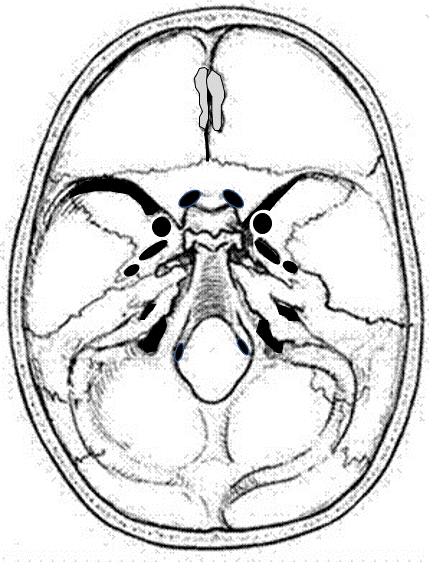 Orificios de la base de cráneoVersión en línea Correlacionar las estructuras de la base de cráneo por David López Cruz 1 Lamina cribosa 2 Hendidura optica 3 Orificio óptico 4 Orificio redondo mayor 5 Orificio oval 6 Orificio espinoso o redondo menor 7 Orificio auditivo interno o petroso 8 Orificio rasgado posterior 9 Orificio de nervio hipogloso 10 Orificio magno