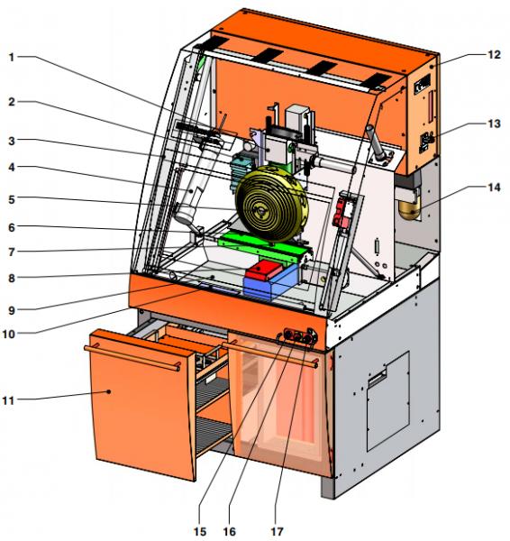 Centro de mecanizado CM105Versión en línea Partes de un centro de mecanizado CNC EMCO ConceptMill105 por Diego Calderon Iturricha 1 Armario eléctrico 2 Interruptor principal 3 Unidad de lubricación automática 4 Carro del eje vertical 5 Unidad neumática 6 Puerta 7 Lámpara 8 Cambiador de herramientas 9 Carro longitudinal 10 Husillo principal 11 Carro transversal 12 Bandeja de virutas 13 Base de máquina 14 Tecla de consenso 15 Parada de emergencia 16 Llave