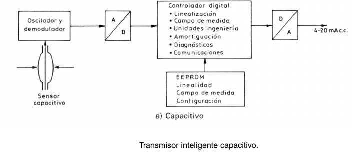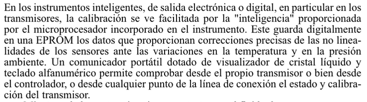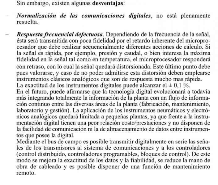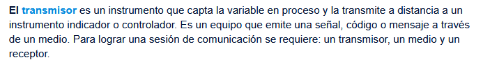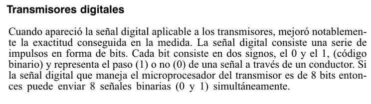 Transmisores electrónicosVersión en línea Transmisores electrónicos REFERENCIA: Creus, S. A. (2005). Instrumentación industrial (7a. ed.). Retrieved from https://ebookcentral.proquest.com Páginas: 63-64 por Fausto Noé Jiménez 1 Es un instrumento que capta la variable en proceso y la transmite a distancia a un instrumento indicador o controlador. Es un equipo que emite una señal, código o mensaje a través de un medio. Para lograr una sesión de comunicación se requiere: un transmisor, un medio y un receptor. a El transmisor b El termistor c El termopar 2 ¿Generalmente utilizan el equilibrio de fuerzas? a Transmisor neumático b Transmisor electrónico c Termistor 3 Generalmente utilizan el equilibrio de fuerzas, el desequilibrio da lugar a una variación de posición relativa, excitando un transductor de desplazamiento tal como un detector de inductancia o un transformador diferencial. a Transmisor neumático b Transmisor electrónico c Termistor 4 Selecciona las características del transmisor electrónico. Escoge una o varias respuestas a Está basado en el detector de inductancia b Utiliza transformadores diferenciales c Utiliza circuitos de puente de Wheastone d Emplea una barra de equilibrio de fuerzas e Convierte la señal de la variable a una señal electrónica f Su exactitud es+- 0,5 % 5 Selecciona aquel o aquellos que sean transmisores electrónicos. Escoge una o varias respuestas a b 6 La señal digital consiste en una serie de impulsos en forma de: Respuesta escrita 7 Hay dos medelos de transmisores digitales inteligentes, cuales son? Escoge una o varias respuestas a Capacitivo b Cemiconductor c PLC 8 Está basado en la variación de capacidad que se produce en un condensador fromado por dos placas fijas y un diafrangma sensible interno y unido en las mismas, cuando se les aplica una presión diferencial a través de un fluido (aceite) que rellena el interior del condensador. a Transmisor inteligente digital capacitivo b Transmisor inteligente digital de semiconductor 9 Aprovecha las propiedades eléctricas de los semiconductores al ser sometidos a tensiones. a Transmisor inteligente digital capacitivo b Transmisor inteligente digital de semiconductor 10 Selecciona la imágen del transmisor inteligente de puente de wheatstone en silicio difundido a b 11 En los transmisores inteligentes de salida electrónica y digital la calibración se ve facilitada por la inteligencia proporcionada por el microprocesador incorporada en el intrumento. a Cierto b Falso 12 Selecciona ventajas de los transmisores digitales Escoge una o varias respuestas a Cambio automático de cambio de medida b Compensación de las variaciones de temperatura c Grabación de datos históricos d Mantenimiento e Rangeabilidad f Autocalibración por variaciones del proceso 13 Selecciona desventajas de los transmisores digitales Escoge una o varias respuestas a La normalización de las comunicaciones no está resuelta b Respuesta frecuencia defectuosa c Grabación de datos históricos