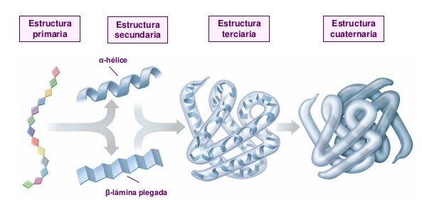 Aminoácidos y ProteínasVersión en línea Química Orgánica Sexto año - secundaria por Sindy Costa García 1 ¿Qué son las proteínas? Respuesta escrita 2 A que estructura pertenece la siguiente imágen a Estructura cuaternaria b Estructura primaria c Estructura secundaria d Estructura terciaria 3 Las proteínas son: Escoge una o varias respuestas a Macromóleculas b Biomoléculas c Orgánicas d Inorgánicas 4 Las proteínas están formadas por a Los mismos 20 aminoácidos b Solo por 10 aminoácidos c Ninguna es correcta d Existen más de 20 aminoácidos 5 La unión de dos aminoácidos forma un a péptido b proteína c polipéptido d digopéptido 6 Indica cual de las estructuras se rompen cuando una proteína se desnaturaliza Escoge una o varias respuestas a Primaria b Secundaria c Terciaria d Cuaternaria 7 ¿Cuándo ocurre la desnaturalización de una proteína? Escoge una o varias respuestas a Cuando se modifica el pH b Cuando se modifica la presión c Cuando se modifica la temperatura d El volúmen 8 Las proteínas cumplen diversas funciones, entre ellas Escoge una o varias respuestas a Enzimática b Reserva c Protectora d Energética 9 Las holoproteínas estan formadas por a por aminoácidos b por una fracción proteínica y por un grupo no proteíco c por un grupo no proteíco d por una fracción de un grupo no proteíco y aminoácidos 10 La estructura cuaternaria de una proteína esta formada por a se unen varias cadenas polipeptídicas con estructura secundaria mediante mediante enlaces débiles, formándose un complejo proteico. b se unen varias cadenas polipeptídicas con estructura terciaria mediante enlaces débiles, formándose un complejo proteico. c se unen aminoácidos mediante enlaces débiles, formándose un complejo proteico. d ninguna es correcta 11 La función de una proteína depende de: a solamente de la forma en que adopte b de la secuencia de los aminoácidos y la forma que esta adopte c no depende de la secuencia de los aminoácidos d depende de los enlaces peptídicos 12 Para que se considere una proteína como tal, cuantos enlaces peptídicos debe contener a un enlace peptídico b entre diez y veinte enlaces peptídicos c no depende de los enlaces peptídicos d más de cincuenta enlaces peptídicos Explicación 1 ll 2 ll 3 ll 4 ll 5 ll 6 ll 7 ll 8 ll 9 ll 10 ll 11 ll 12 ll