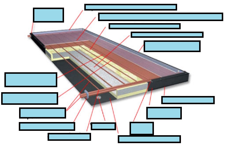Panel solar planoVersión en línea Acierta las partes por Juan Carlos Gómez Pérez 1 Esquinas ribetadas 2 sujetadores acero inoxidable 3 vidrio templado de bajo contenido en hierro 4 aislante fibra de vidrio 5 aislante de espuma rigida 6 sellado secundario de silicona 7 capa negra de pintura cromada 8 lamina absorbente de cobre 9 tubos de cobre tipo M 10 abrazaderas EDPM 11 juntas de plata 12 ventiladores 13 respaldo de aluminio 14 sellado EPDM 15 caja anodizada 16 montado integral