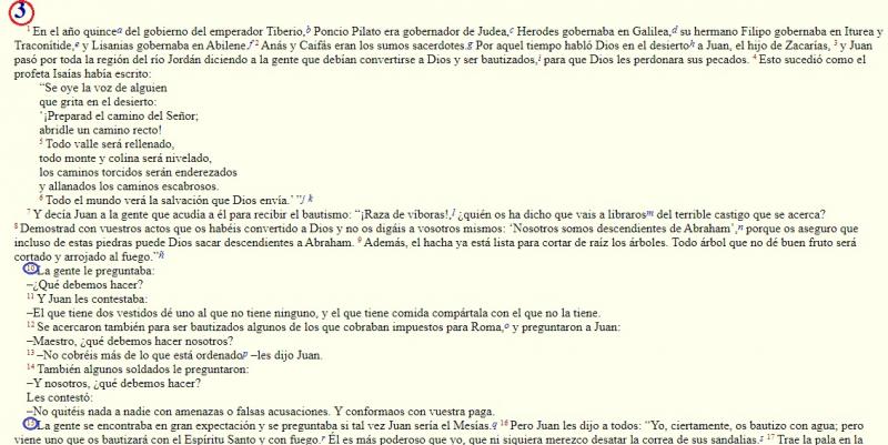 La BibliaVersión en línea Qué es, cómo se estructura y cómo buscar en la Biblia por Laura Segarra Roitegui 1 La Biblia La Biblia es una colección de libros que contiene las historias y doctrinas cristianas, con base en la tradición judía (Antiguo Testamento) y el anuncio del Evangelio (Nuevo Testamento).Tiene 73 libros: 46 en el Antiguo Testamento y 27 en el Nuevo Testamento. 2 partes de la Biblia Como hemos visto antes, la Biblia es una colección de libros y se dividen en:Antiguo Testamento: que nos cuenta la relación de Dios con el pueblo de Israel y donde encontramos libros como el Génesis (la creación, Noé...), Éxodo (Historia de Moisés), libros poéticos, libros de los profetas...Nuevo Testamento: en el que encontramos la vida y enseñanzas de Jesús, concretamente en los Evangelios (Mateo, Marcos, Lucas y Juan); el principio de la Iglesia (Hechos de los apóstoles); las Cartas de los apóstoles a las diferentes comunidades y el libro profético del Apocalipsis. 3 Los libros de la biblia Cada libro de la Biblia se divide en partes para que nos resulte más fácil encontrar lo que buscamos.Capítulo: divide el texto en partes más pequeñas que tiene sentido completo por sí mismo. Lo podemos ver en cada libro con números grandes.Versículo: divide cada capítulo en frases más pequeñas. Dentro de cada capítulo los encontramos con números más pequeños.Además de los números correspondientes al capítulo y los versículos, también podemos encontrar letras pequeñas que son explicaciones del texto que podemos encontrar, normalmente, al final de la página. 4 Como buscar en la Biblia En la imagen podemos ver una citación Bíblica.Las letras son la abreviatura del libro en el que tenemos que buscar. En este caso Lc es el Evangelio de Lucas.El primer número (3) es el número del capítulo dentro del libro en el que tenemos que buscar (Evangelio de Lucas)Los números detrás de la coma son los números de los versículos que debemos encontrar dentro del capítulo (del 10 al 15, debemos leer hasta que encontremos el número 16)En la siguiente página verás el resultado de esta búsqueda 5 resultado de la búsqueda