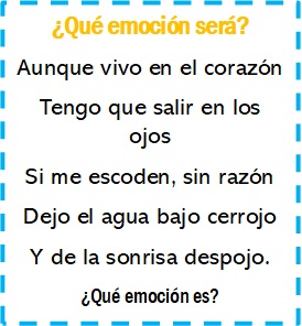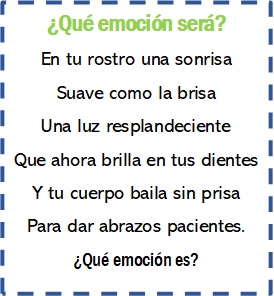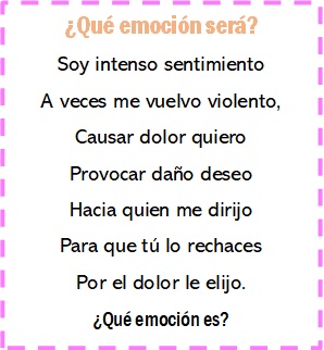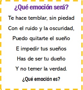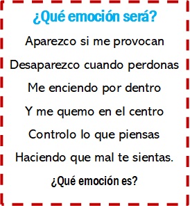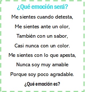 ADIVINA, ADIVINADOR Versión en línea Lee cada adivinanza y escoge la emoción que creas correcta, ¡Vamos tú puedes! por KAREN DAYANA RINCON CAMPOS 1 ADIVINA, ADIVINADOR... a Felicidad b Tristeza c Enfado 2 ADIVINA, ADIVINADOR... a Asco b Miedo c Tristeza 3 ADIVINA, ADIVINADOR... a Rabia b Miedo c Felicidad 4 ADIVINA, ADIVINADOR... a Tristeza b Sorpresa c Enfado 5 ADIVINA, ADIVINADOR... a Tristeza b Ira c Felicidad 6 ADIVINA, ADIVINADOR... a Asco b Miedo c Confianza