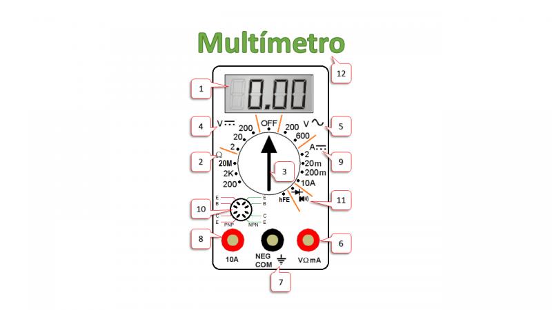 Partes del MultímetroVersión en línea Desarrollo de dominio y destreza para identificar la estructura del multimetro. por S JM 1 Visualizador de cristal líquido (Display) 2 Óhmetro 3 Selector múltiple 4 Voltímetro de continua 5 Voltímetro de alterna 6 Terminal de Voltio/Ohmio/Amperio 7 Terminal común 8 Terminal amperímetro 9 Amperímetro de continúa 10 Probador de transistores 11 Probador de diodos 12 Multímetro
