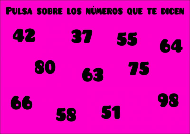 NúmerosVersión en línea En esta imagen hay un montón de números. Ve pulsando en los números que te dice. por CEIP VIRGINIA PÉREZ 1 CUARENTA Y DOS 2 SESENTA Y CUATRO 3 OCHENTA 4 SESENTA Y SEIS 5 CINCUENTA Y OCHO 6 NOVENTA Y OCHO 7 TREINTA Y SIETE 8 CINCUENTA Y CINCO 9 SESENTA Y TRES 10 SETENTA Y CINCO 11 CINCUENTA Y UNO