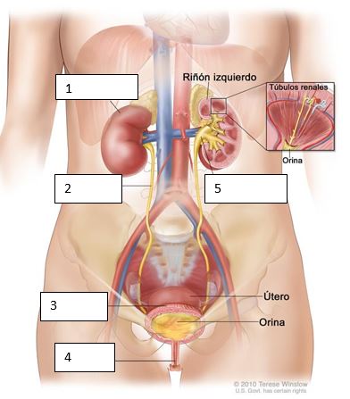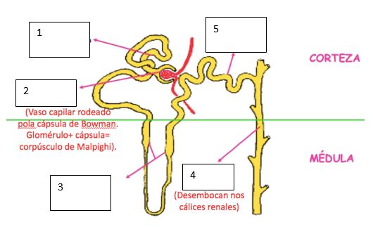Aparello excretorVersión en línea Test sobre o aparello excretor, centrándose no sistema urinario. por Ledicia Santos 1 Cal é a función do aparello excretor? a Transportar nutrientes procedentes da dixestión e sustancias de refugallo. b Eliminar sustancias de refugallo producidas no metabolismo. c Expulsar o osíxeno que proven da respiración celular. 2 Nos riles distinguimos: a Codia, médula, pelve renal e vasos sanguíneos b Codia, médula, pelve renal e uréteres c Codia, médula, pelve renal, vasos sanguíneos e uréteres 3 Onde ten lugar a formación dos ouriños? a Na codia dos riles b Na pelve renal c Nos nefróns 4 Que representa cada número? Escribe o nome. Resposta escrita 5 A partir de que procesos ten lugar a formación dos ouriños? citaos por orde a Filtración, reabsorción, secreción b Absorción, expusión, filtración c Filtración, secreción, reabsorción 6 A función dos uréteres é a Conducir e impulsar a urina cara á vexiga grazas ás contraccións da musculatura das súas paredes. b Formar os ouriños por medio dos procesos de filtración, reabsorción e secreción. c Expulsar os ouriños ó exterior. 7 A filtración consiste en a Transportar nutrientes procedentes da dixestión e sustancias de refugallo. b Paso de sangue dende os capilares ó interior da cápsula de bowman c Paso de plasma sanguíneo dende os capilares ó interior da cápsula de bowman 8 A reabsorción é a Un proceso que ten lugar no túbulo contorneado proximal e que continúa na asa de Henle e no túbulo contorneado distal que consiste no paso de sustancias útiles (glicosa, aminoácidos...) do túbulo ó sangue b Un proceso que ten lugar no túbulo colector no que sustancias químicas nocivas se incorporan ó túbulo para ser expulsadas c Un proceso que ten lugar no túbulo contorneado proximal e que continua na asa de henle e no túbulo contorneado distal e que consiste na absorción de sustancias útiles, coma glicosa e aminoácidos, do sangue cara ao túbulo 9 Algunhas das enfermidades asociadas ó sistema urinario son: Escolle unha ou máis respostas a Cistite, calculos renais e insuficiencia respiratoria b Cálculos renais, cistite e insuficiencia renal c Cistite, cálculos renais, ictus e insuficiencia renal 10 Que representa cada número? Escribe o nome. Resposta escrita