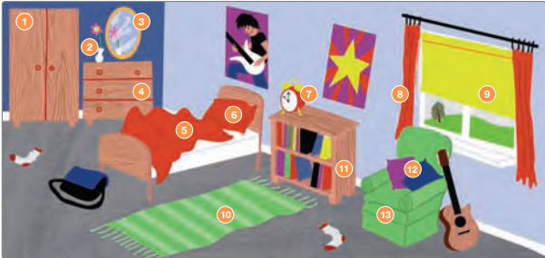 Furniture and Household objectVersión en línea Vocabulary connected with furniture and household objects (based on book Next Move 3) por Rosana Techera 1 wardrobe 2 vase 3 mirror 4 chest of drawers 5 duvet 6 pillow 7 alarm clock 8 curtains 9 blind 10 rug 11 bookcase 12 cushions 13 armchair