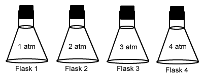Gases Laws ExamVersión en línea Escribe tus resultados: NÚMERO+(espacio)+UNIDAD (sólo la letra correspondiente). Por ejemplo: 10 m. por Judith Bilbao Rodríguez 1 A small sample of helium gas occupies 6 mL at a temperature of 250 K. At what temperature does the volume expand to 9 mL? (Una pequeña muestra de gas helio ocupa 6 ml a una temperatura de 250 K. ¿A qué temperatura se expande el volumen a 9 ml?) Written answer 2 When a supply of hydrogen gas is held in a 4-liter container at 320 K it exerts a pressure of 800 kPa. The supply is moved to a 2-liter container, and cooled to 160 K. What is the new pressure of the confined gas? (Cuando se mantiene un suministro de gas hidrógeno en un recipiente de 4 litros a 320 K, ejerce una presión de 800 kPa. El suministro se traslada a un recipiente de 2 litros y se enfría a 160 K. ¿Cuál es la nueva presión del gas confinado?) Written answer 3 Each of these flasks is the same size and at the same temperature. Which one contains the most molecules? (Cada uno de estos matraces son del mismo tamaño y están a la misma temperatura. ¿Cuál contiene la mayor cantidad de moléculas?) a Flask 1 (Matraz 1) b Flask 2 (Matraz 2) c Flask 3 (Matraz 3) d Flask 4 (Matraz 4) 4 Neon gas has a volume of 2000 l with a pressure of 2 atm however, the pressure decreased to 1 atm, what is now the volume of the neon gas? (El gas de neón tiene un volumen de 2000 l con una presión de 2 atm. Sin embargo, si la presión disminuye a 1 atm, ¿cuál es ahora el volumen del gas de neón? Written answer 5 Each of these flasks contains the same number of gas molecules. In which would the pressure be lowest? (Cada uno de estos matraces contiene el mismo número de moléculas de gas. ¿En cuál sería la presión más baja?) Choose one or more answers a Flask 1 (Matraz 1) b Flask 2 (Matraz 2) c Flask 3 (Matraz 3) d Flask 4 (Matraz 4) 6 The gas in a balloon has a volume of 4 L at 12000Pa. The balloon is released into the atmosphere and the gas in it expands to a volume of 8 L. Determine the pressure on the balloon at the new volume. (El gas en un globo tiene un volumen de 4 L a 12000Pa. El globo se libera a la atmósfera y el gas en él se expande a un volumen de 8 L. Determine la presión en el globo en con el nuevo volumen.) Written answer 7 Blast furnaces give off many unpleasant and unhealthy gases. If the total air pressure is 0.99 atm, the partial pressure of carbon dioxide is 0.05 atm, and the partial pressure of hydrogen sulfide is 0.02 atm, what is the partial pressure of the remaining air? (Los altos hornos emiten muchos gases desagradables y poco saludables. Si la presión total del aire es 0.99 atm, la presión parcial del dióxido de carbono es 0.05 atm, y la presión parcial del sulfuro de hidrógeno es 0.02 atm, ¿cuál es la presión parcial del aire restante?) Written answer 8 The gases in a hair spray can are at a temperature of 27 ºC and a pressure of 30 mm Hg. If the gases in the can reach a pressure of 90 mm Hg, the can will explode. To what temperature must the gases be raised in order for the can to explode? (Los gases en una lata de spray para el cabello están a una temperatura de 27 ºC y una presión de 30 mm Hg. Si los gases en la lata alcanzan una presión de 90 mm Hg, la lata explotará. ¿A qué temperatura deben elevarse los gases para que la lata explote?) Written answer 9 A metal tank contains three gases: oxygen, helium, and nitrogen. If the partial pressures of the three gases in the tank are 30 atm of O2, 2280 mmHg of N2, and 202000 Pa of He. What is the total pressure inside of the tank? (Un tanque de metal contiene tres gases: oxígeno, helio y nitrógeno. Si las presiones parciales de los tres gases en el tanque son 30 atm de O2, 2280 mmHg de N2 y 202000 Pa de He, ¿cuál es la presión total dentro del tanque? ) Written answer 10 4350 mL of a gas is at 1,16 atm. What pressure is obtained when the volume is 9,3 L? (4350 mL de un gas está a 1,16 atm. ¿Qué presión se obtiene cuando el volumen varía a 9,3 L?) Written answer 11 Each of these flasks contains the same number of molecules. In which container is the pressure highest? (Cada uno de estos matraces contiene el mismo número de moléculas. ¿En qué recipiente es la presión más alta?) Choose one or more answers a Flask 1 (Matraz 1) b Flask 2 (Matraz 2) c Flask 3 (Matraz 3) d Flask 4 (Matraz 4) 12 A gas has a volume of 4.0 liters at 50 ºC. What will its volume be (in liters) at 100 ºC? (Un gas tiene un volumen de 4.0 litros a 50 ºC. ¿Cuál será su volumen (en litros) a 100 ºC?) Written answer 13 A gas has a volume of 39 liters at STP. What will its volume be (in liters) at 4 atm and 25 ºC? (Un gas tiene un volumen de 39 litros en STP. ¿Cuál será su volumen (en litros) a 4 atm y 25 ºC?) Written answer 14 Assuming that the temperature remains constant. How can you increase the pressure of a gas? (Suponiendo que la temperatura se mantenga constante. ¿Cómo puedes aumentar la presión de un gas?) Choose one or more answers a Increase the container volume. (Aumentar el volumen del contenedor) b Decrease molecules of the gas. (Reducir las moléculas de gas.) c Decrease the container volume. (Disminuir el volumen del contenedor.) d None of the above. (Ninguna de las anteriores) 15 As the temperature of a confined gas decreases at a constant volume, the pressure exerted by the gas... (A medida que la temperatura de un gas confinado disminuye a un volumen constante, la presión ejercida por el gas ...) Choose one or more answers a Increases. (Aumenta) b Decreases. (Disminuye) c Stay the same. (No cambia) d None of the above. (Ninguna de las anteriores)