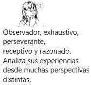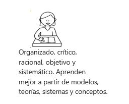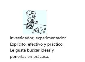 Estilo cognitivo.aprendizajeVersión en línea Responde de acuerdo a las instrucciones del test por Claudia Jimena Arenas 1 Les gusta pensar por sí mismos. Son autónomos y confiados en su aprendizaje. a Independiente b Egoista c Único d Individual 2 Indica el modelo de estilo de aprendizaje que trabaja la información en cuatro fases: Respuesta escrita 3 Indica a qué estilo cognitivo pertenece la imagen a Dependencia b Holista c Ambientalista d Individualista 4 Indica a qué estilo cognitivo pertenece la imagen Respuesta escrita 5 Indica a qué estilo cognitivo pertenece la imagen Respuesta escrita 6 Indica a qué estilo cognitivo pertenece la imagen a Enérgico b Alegre c Impulsivo d Bravo 7 Indica a qué estilo cognitivo pertenece la imagen Respuesta escrita 8 Indica a qué estilo cognitivo pertenece la imagen a Pragmático b Reflexivo c Práctico d Audaz e Integral 9 Aprenden paso a paso relacionando el paso siguiente paso con el anterior. Son ordenados y lineales, cuando tratan de solucionar un problema tienden a seguir caminos por pequeños pasos lógicos Respuesta escrita 10 Modelo que se inspira en los conocimientos del funcionamiento cerebral Respuesta escrita 11 Indica a qué estilo de aprendizaje pertenece la imagen Respuesta escrita 12 Indica a qué estilo de aprendizaje pertenece la imagen Respuesta escrita 13 Indica a qué estilo cognitivo pertenece la imagen Respuesta escrita Explicación 1 Independiente: Les gusta pensar por sí mismos. Son autónomos y confiados en su aprendizaje. 2 Método de Kolb: El modelo de estilos de aprendizaje elaborado por Kolb supone que para aprender algo debemos trabajar o procesar la información que recibimos 3 Holista: percepción global de un aprendizaje 4 Reflexivo: Observador, analizador 5 Kinestésico: movimiento 6 Impulsivo: Tendencia a responder rápidamente sin reflexionar 7 Teórico: organizado, racional 8 Pragmático: Investigador 9 Secuencial: Aprenden paso a paso relacionando el paso siguiente paso con el anterior. Son ordenados y lineales, cuando tratan de solucionar un problema tienden a seguir caminos por pequeños pasos lógicos 10 Modelo de Herrmann: modelo que se inspira en los conocimientos del funcionamiento cerebral. 11 Auditivo: Este estilo está relacionado con hablar y escuchar 12 Visual: Prefieren leer a escuchar y captan grandes cantidades de información solo mirando, piensan en imágenes, y visualizan en detalle. 13 Verbal: La modalidad preferida de representación de ideas y conceptos en la mente es la verbal (palabras)