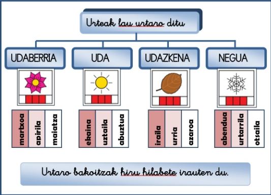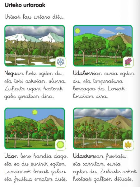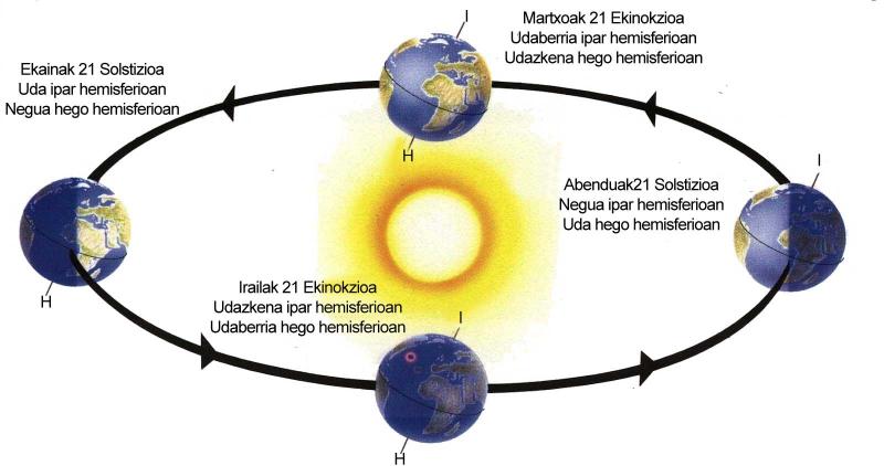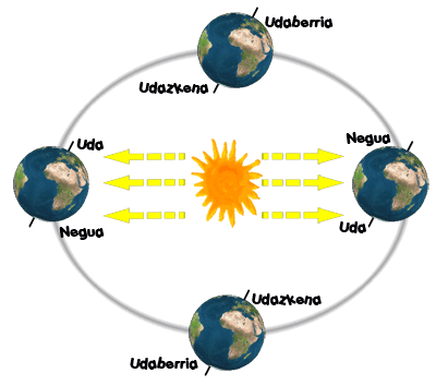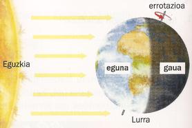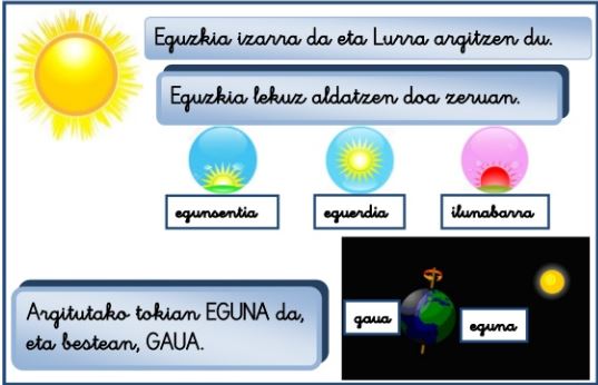 Errotazioa/TranslazioaVersión en línea Adi irakurri!! por Nagore Les 1 EGUZKI-SISTEMA Eguzki-sistema 8 planetaz osatuta dago eta planeta guztiek Eguzkiaren inguruan bira egiten dute. 2 EGUZKIA Eguzkia izar bat da, argia eta beroa ematen diguna. Oso izar handia da, baina ez da zeruan dagoen izarrik handiena. 3 PLANETAK Planeta bat berezko argirik ez duen zeruko gorputza da, izar baten inguruan biraka dabilena. 8 planeta daude: Merkurio, Artizarra, Lurra, Marte, Jupiter, Saturno, Urano eta Neptuno. 4 ILARGIA Ilargia Lurraren inguruan jiraka dabilen zeruko gorputza da. Satelite bat da. Ilargiak ez du berezko argirik, baizik et Eguzkitik datorkion argia islatzen du. 5 ILARGIAREN FASEAK 6 ILARGIAREN FASEAK 7 LURRAREN HIGIDURAK Lurrak bi mugimendu egiten ditu: ERROTAZIOA eta TRANSLAZIOA 8 ERROTAZIOA ERROTAZIOALurrak bere ardatzaren inguruan bira egiten du. 24 orduko iraupena du mugimendu honek. Ondorioz, eguna eta gaua sortzen dira. 9 EGUN BAT Eguzkitik datorkigun argia eta beroa aldatuz doa egunean zehar: EGUSENTIA: Eguzkiaren argia agertzen da ekialdetik. EGUERDIA: Eguzkia punturik gorenean dago. Argitasun handia dago. ILUNABARRA: Eguzkia mendebaldean ezkutatzen da. Argitasun gutxiago dago. GAUA: Eguzkia ezkutatuta dago eta ez dago argirik. 10 TRANSLAZIOA TRANSLAZIOALurrak Eguzkiaren inguruan bira egiten du. Ondorioz, urtaroak sortzen dira: udaberria, uda, udazkena eta negua.365 eguneko iraupena du mugimendu honek. 11 URTAROAK 12 URTAROAK 13 URTAROAK
