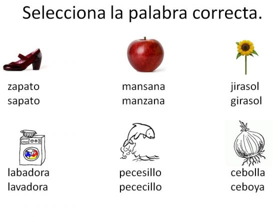 Palabras bien...Versión en línea Actividad en la que se deben seleccionar las palabras que están bien escritas. por Sharon Flores 1 zapato 2 zapato 3 manzana 4 manzana 5 girasol 6 girasol 7 lavadora 8 ¡correcto! 9 correcto! 10 x 11 correcto! 12 ¡correcto! 13 x